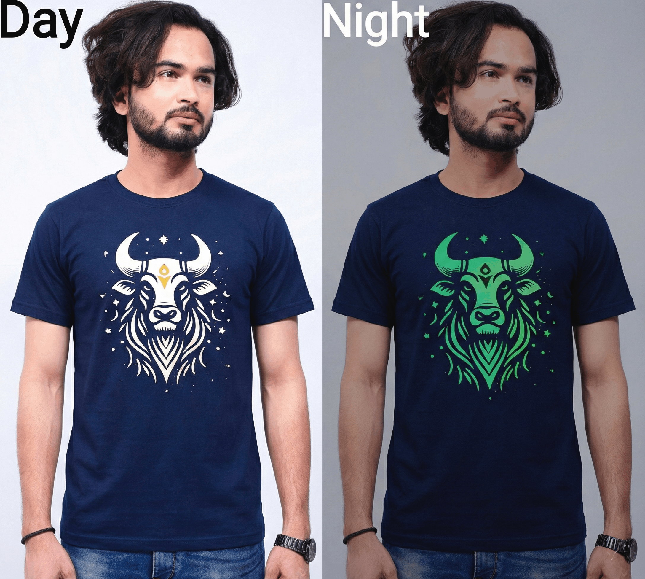 Illuminate your style with our Glow-in-the-Dark Nandi Design Round Neck T-Shirt! This unique t-shirt combines spiritual inspiration with a modern twist, featuring a beautifully detailed Nandi design that glows brilliantly in the dark. Perfect for festivals, night events, or simply making a bold statement, this round-neck tee is crafted from high-quality, soft cotton for maximum comfort. The glow effect adds an eye-catching element that makes you stand out in any crowd. Ideal for those who love blending tradition with trend, this t-shirt is a must-have addition to your wardrobe. Available in multiple sizes, get yours now and let your style shine day and night. It also glows better when you come from direct sunrays to a darker area. It glows in a neon greenish color.