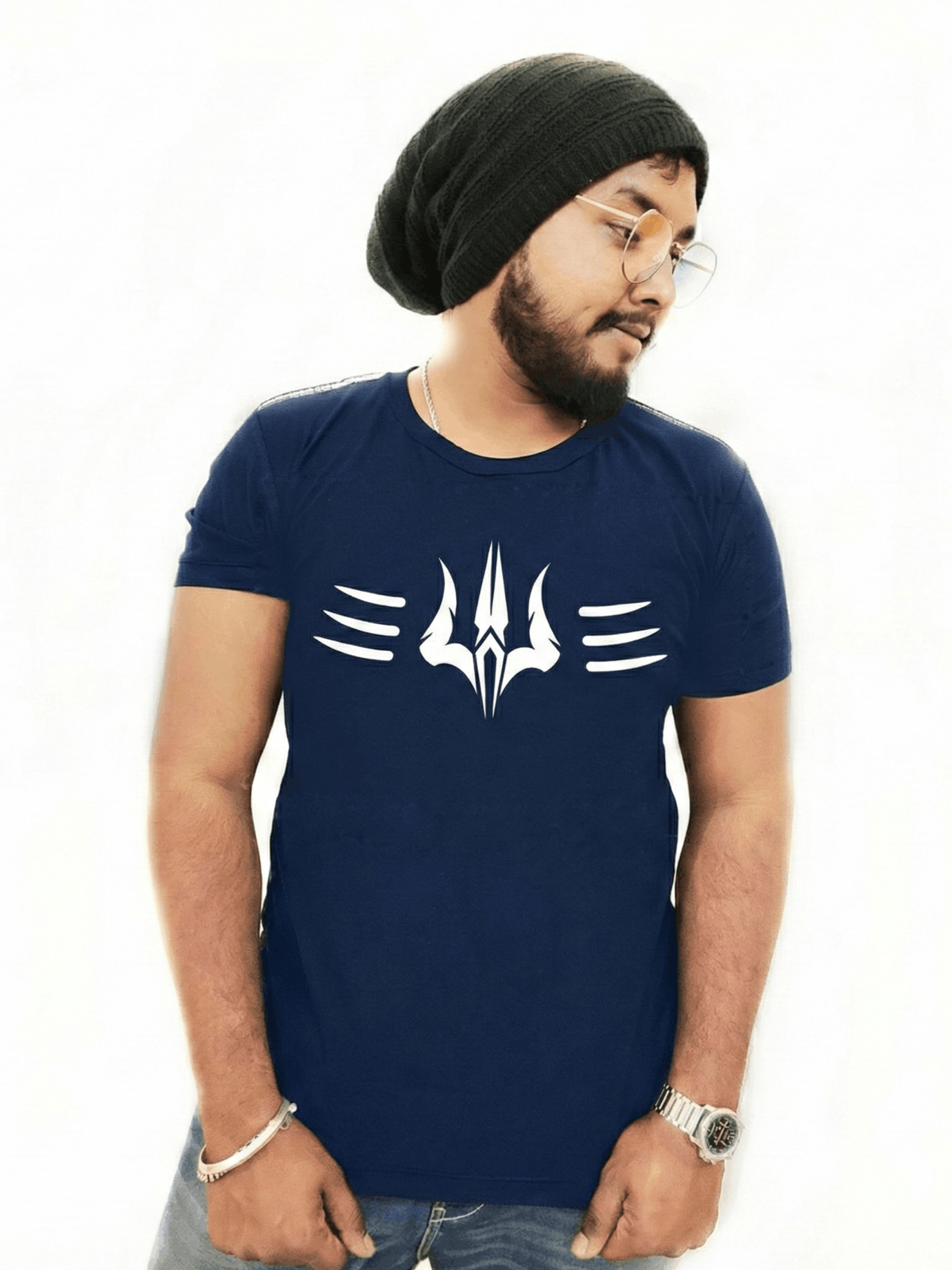 This is a glowing T-shirt that glows in the dark because of the Glowing print. This T-shirt has a Mahadev Trishul design that glows at night. It also glows better when you come from direct sunlight to a darker area. It glows in a neon greenish color.
